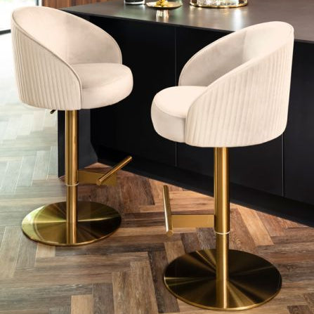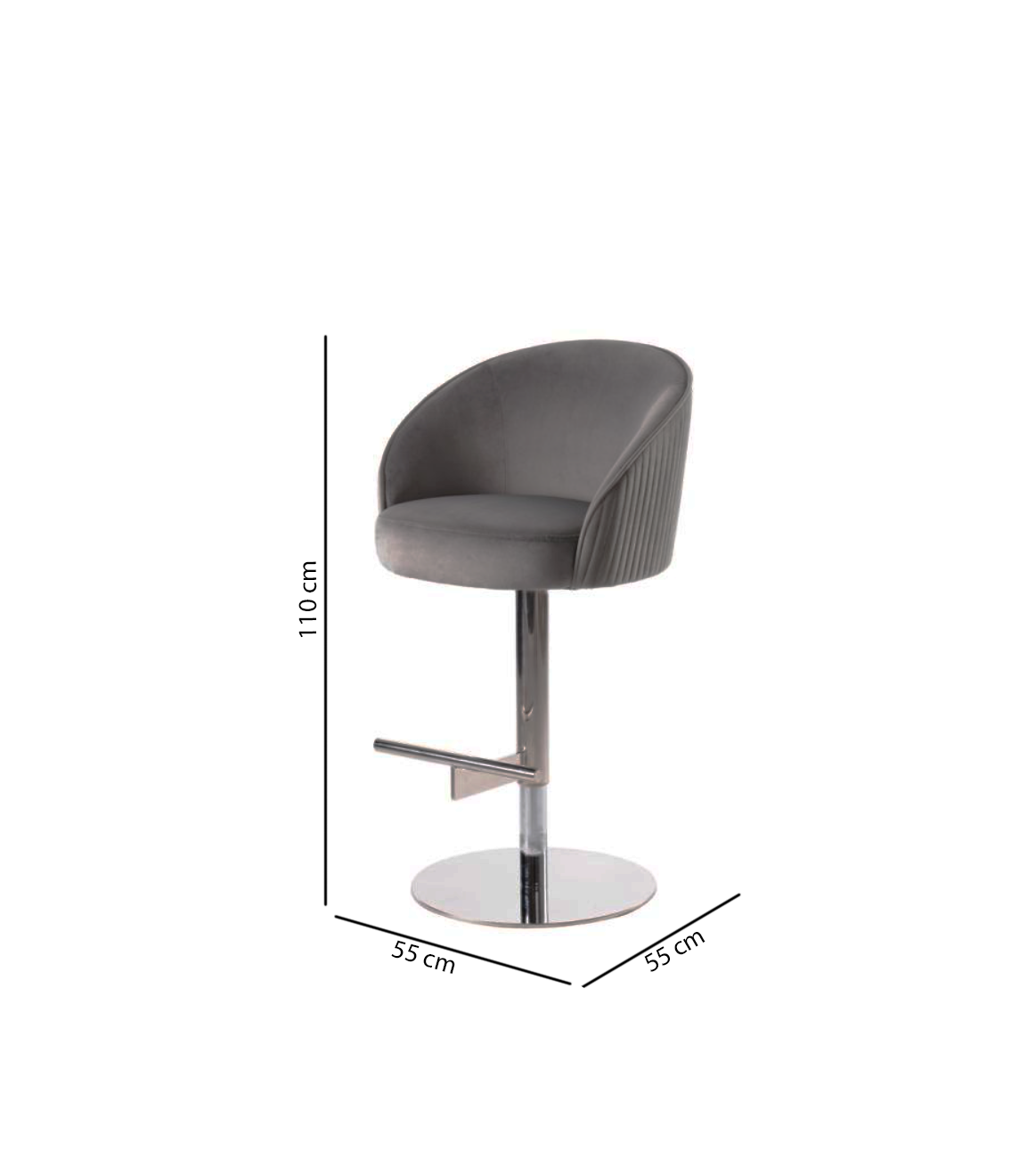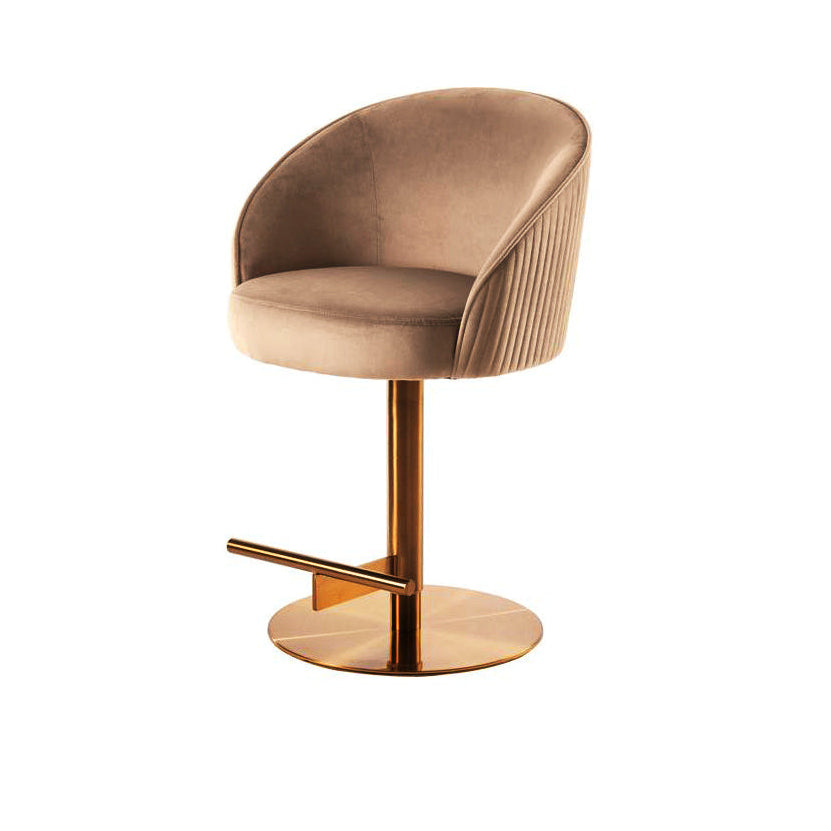 The brushed stainless steel structure with brass accents provides architectural interest and durability, while premium velvet upholstery elevates the tactile experience. Featuring adjustable height and full-rotation swivel mechanics, it adapts effortlessly to bar or counter heights. An investment piece that marries functional versatility with refined aesthetic presence.