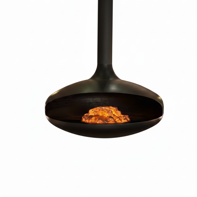 Suspended elegantly from a ceiling-mounted rod, this architectural fireplace commands attention through its striking vertical presence and mesmerizing open flame. Engineered from premium-grade steel, it delivers sophisticated ambiance without requiring flue systems or electrical connections. Select between rectangular or round burner configurations to suit your aesthetic vision.