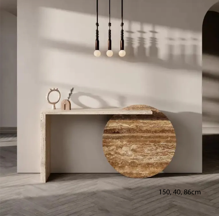 This striking console table merges timeless sophistication with contemporary design, making it an ideal focal point for entryways and hallways. Constructed from authentic white and brown Travertine marble, each piece displays unique veining and subtle earth-toned variations inherent to natural stone. The material's inherent durability and refined aesthetic create a statement piece that commands attention while maintaining understated elegance. Perfect for those seeking to introduce genuine marble craftsmanship into their interior spaces.