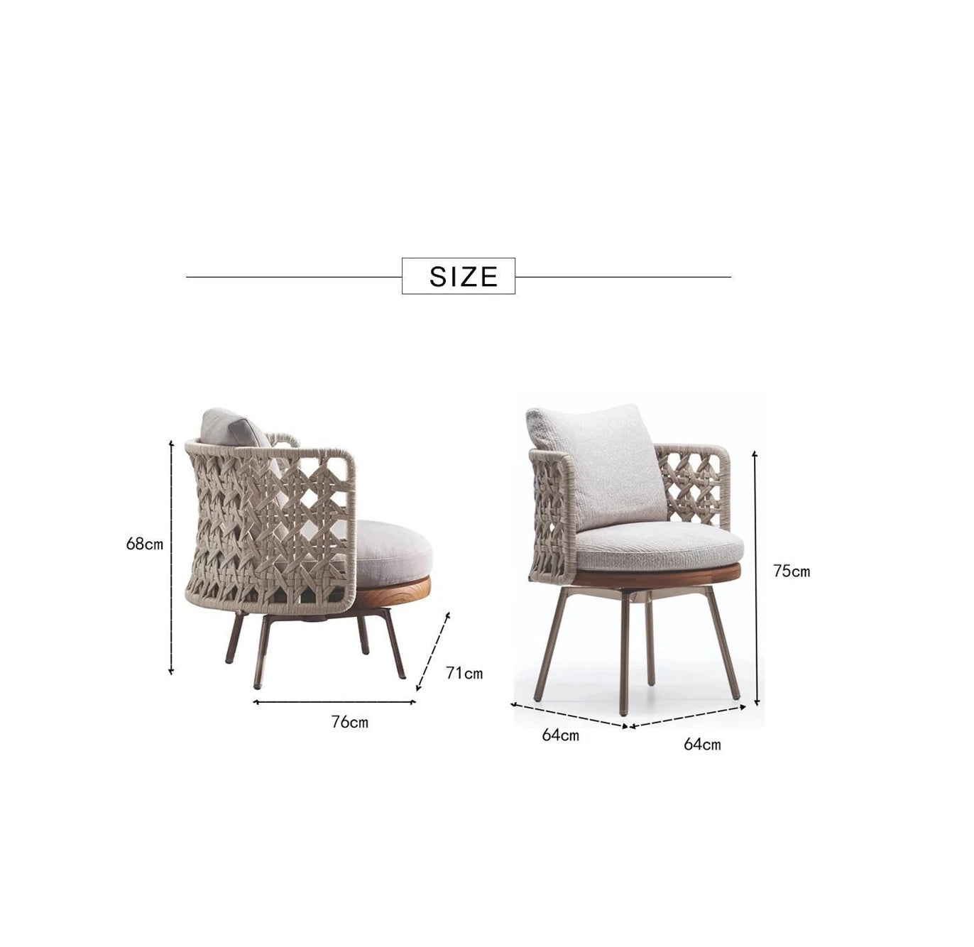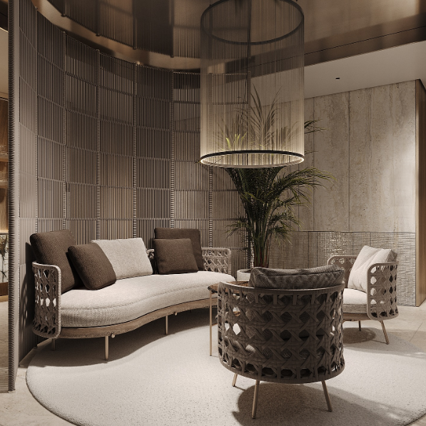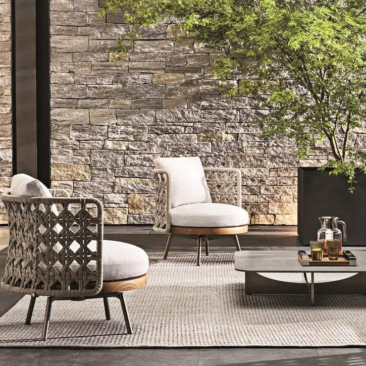The woven cord backrest, inspired by traditional cane work, is crafted with a more open weave that allows light and air to pass through. Set on a natural teak or dark brown mahogany base and supported by painted aluminium legs with a polished bronze finish, the design balances lightness with material richness. Available in a range of configurations—from armchairs to curved two-seater sofas and chaise longues—Torii Nest Outdoor offers a harmonious blend of elegance, comfort, and contemporary versatility, perfectly suited to terraces, gardens, and hospitality spaces.