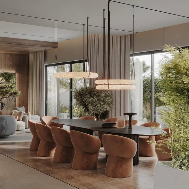 The round alabaster LED light features a smooth, sculptural form crafted from natural alabaster stone, giving it a refined and luxurious appearance. Its softly curved silhouette diffuses light evenly through the translucent stone, creating a warm, ambient glow with subtle natural veining that adds depth and character. Suspended or ceiling-mounted, the integrated LED provides energy-efficient illumination while maintaining a calm, elegant atmosphere. This type of lighting is ideal for dining or living spaces, as it delivers gentle, glare-free light that enhances comfort and complements modern, minimalist, or contemporary interior designs.