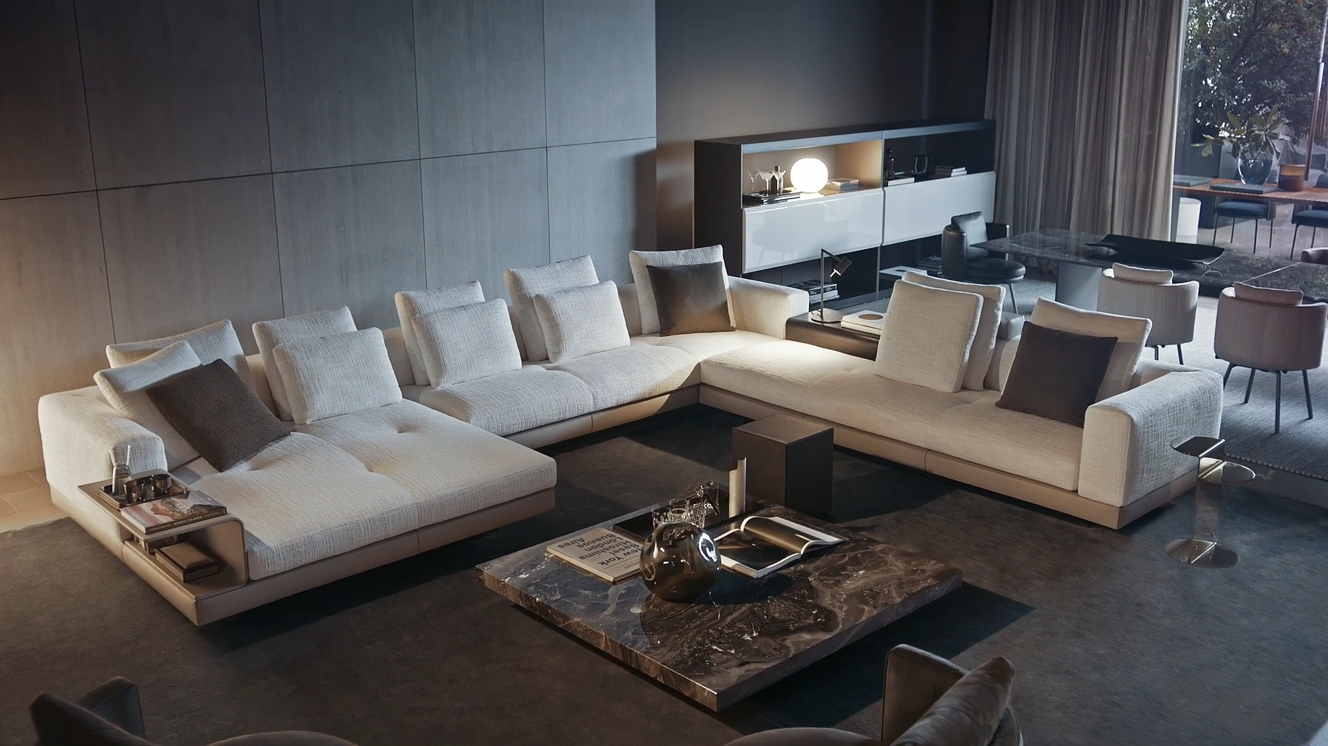 Contemporary and strongly architectural, the Connery seating system channels the clean lines and refined spirit of Mid‑Century American design. Its striking silhouette and meticulous detailing give it an immediately captivating aesthetic, while an expert mix of premium materials introduces a subtle couture sensibility.