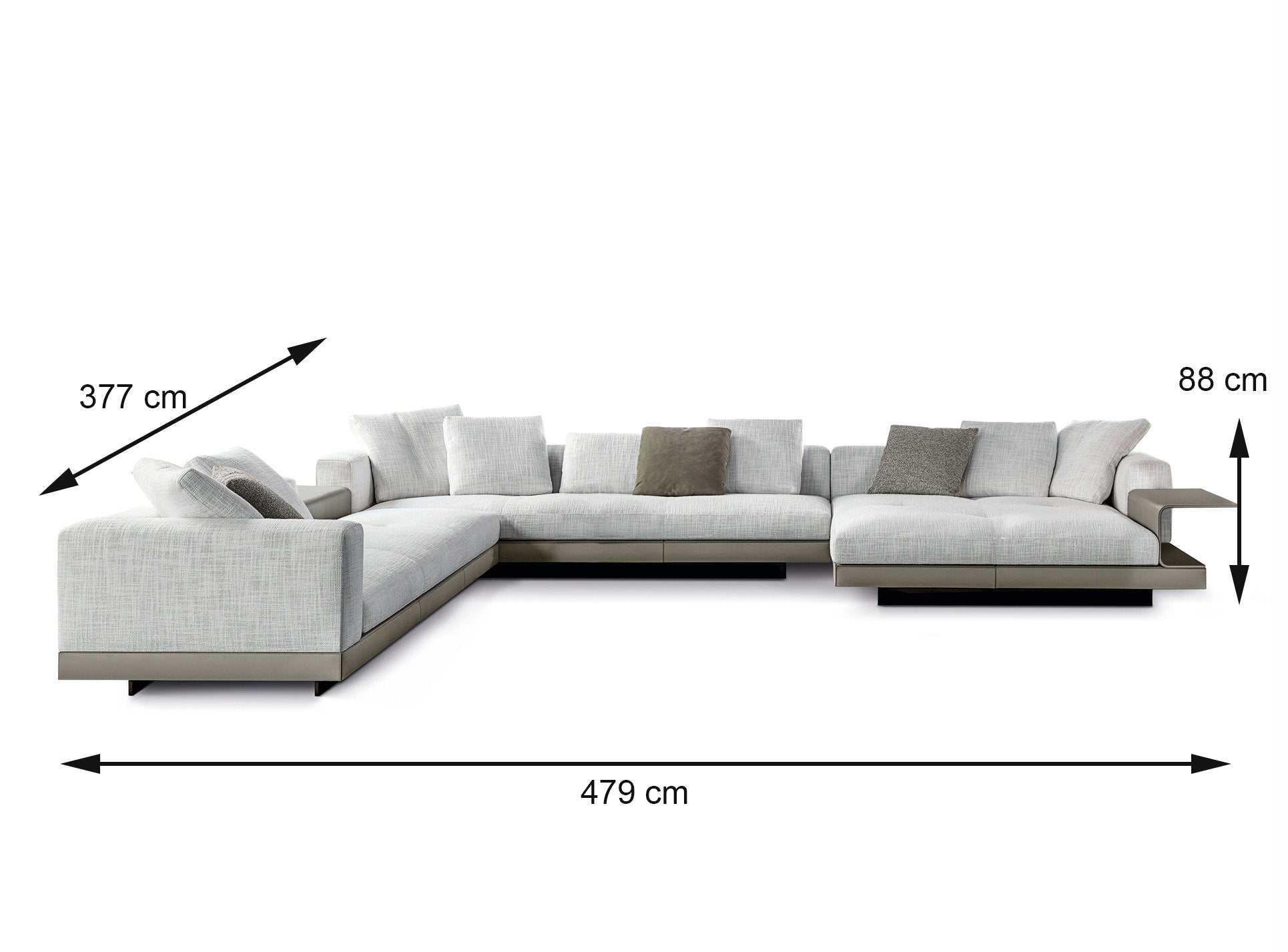 Highly adaptable in both layout and material combinations, Connery projects a distinctive character through the interplay of its original square and round chaise‑longues. The geometric precision of the base provides a compelling counterpoint to the soft, unified seat cushion available in 83 cm or 68 cm widths subtly defined by fine stitching. The backrest and armrest form a single, flowing volume, padded with channelled goose down and meeting in the corner with a 45° split for a sculptural finish.