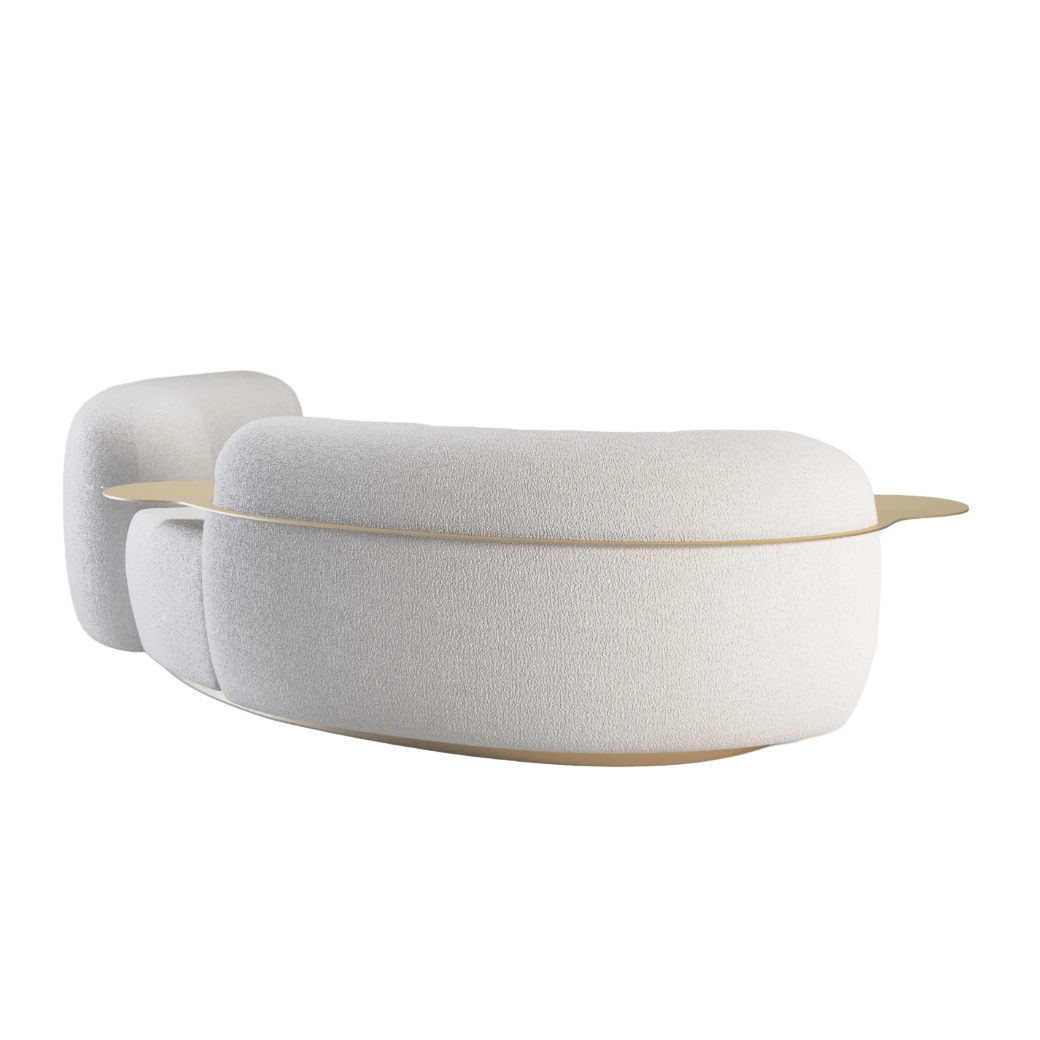 A sculptural, pod‑inspired sofa with sumptuous, cloud‑like seating and built‑in brass‑tone trays style and comfort in one statement piece.