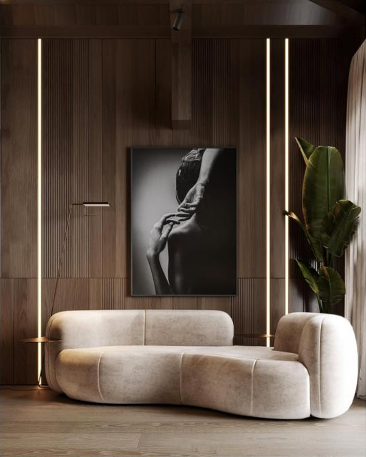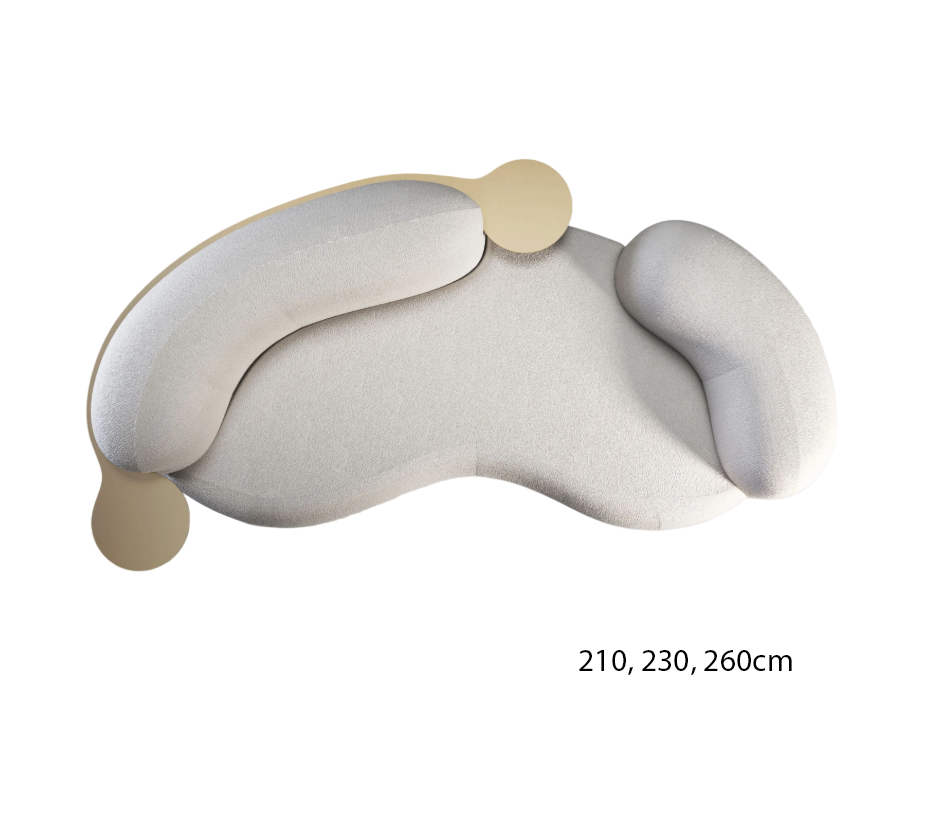 Inspired by organic pea‑pod lines, this sculptural sofa blends modern design with irresistible comfort. Generously padded, low‑profile seating and rounded armrests create a cozy, lounge‑ready silhouette that invites you to sink in. Subtle brass‑tone side trays are integrated into the arms to hold a drink or phone, adding a practical, boutique‑hotel detail without interrupting the clean curves.