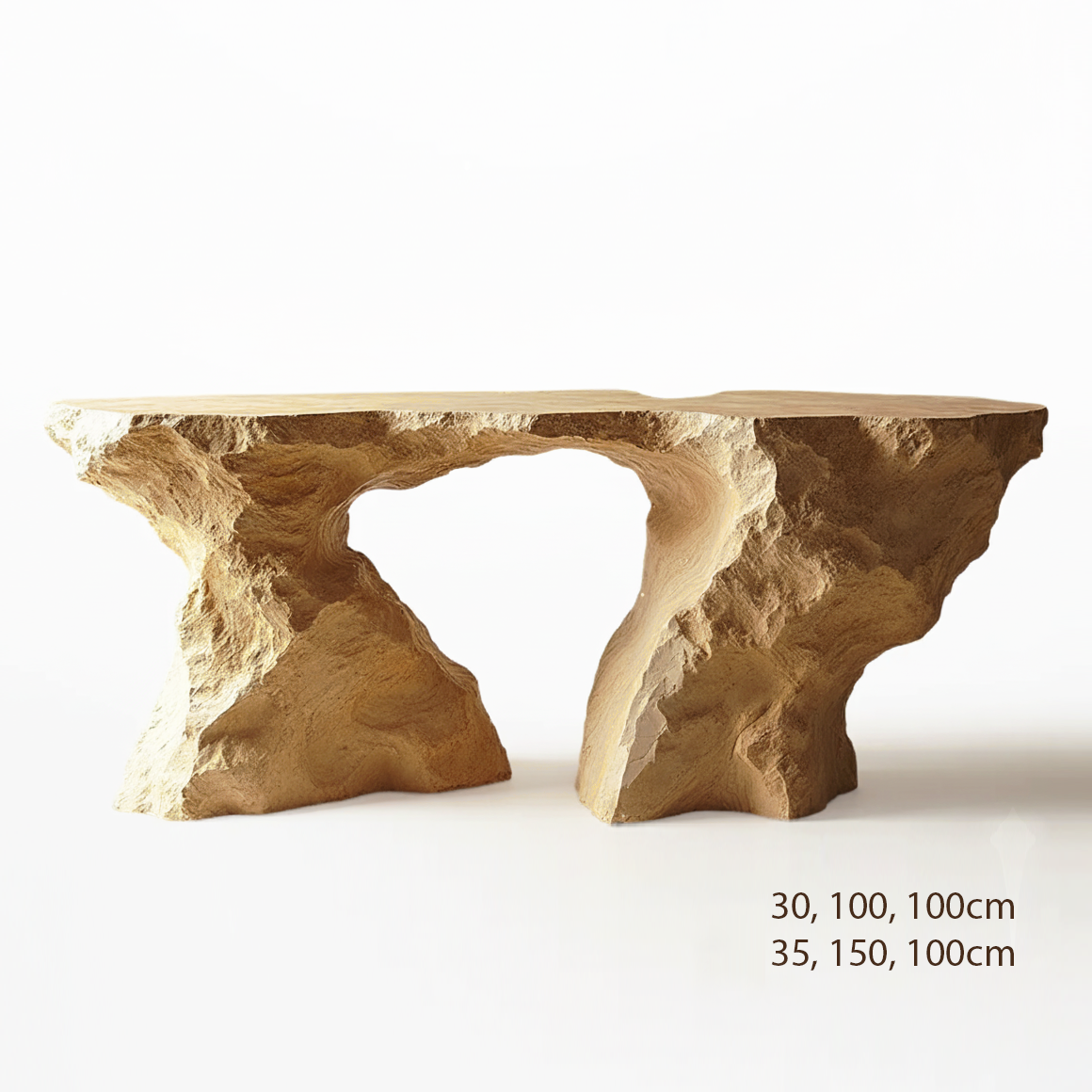 The Desert Dune stands as an architectural masterpiece that transcends conventional furniture design. This exclusive creation merges sculptural artistry with functional elegance, featuring a striking travertine base carved with organic, irregular patterns that evoke wind-swept desert landscapes. The brutalist aesthetic provides commanding visual weight while maintaining refined sophistication. Atop this textured foundation sits a polished working surface, establishing a compelling dialogue between raw materiality and refined utility. Constructed from premium travertine marble, the console delivers exceptional durability and thermal stability, its warm mineral palette developing character over time. Each piece arrives with a certificate of authenticity, confirming its singular provenance. An investment in contemporary design that anchors modern interiors with understated grandeur.