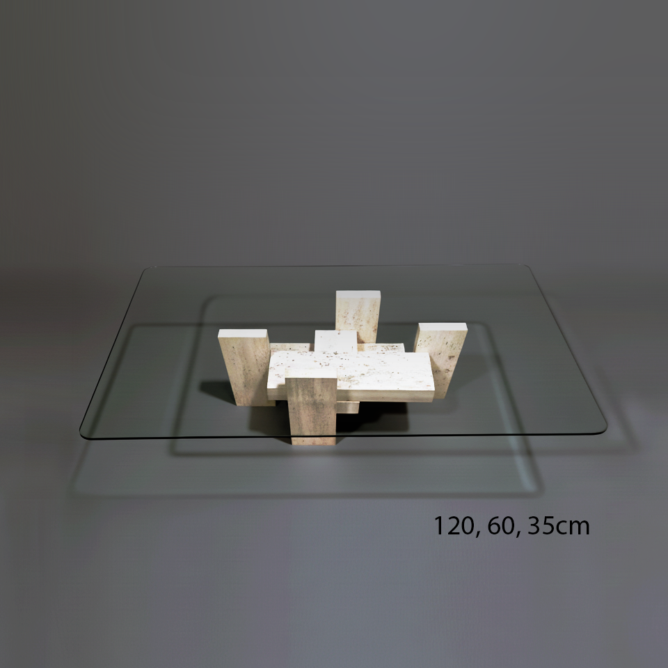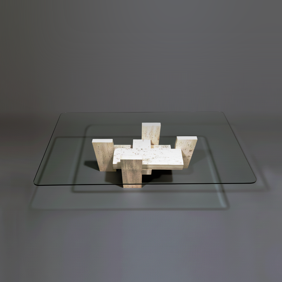 A striking midcentury coffee table by renowned Belgian designer Willy Ballez, circa 1970. The sculptural base showcases travertine slabs arranged in a geometric composition of interlocking horizontal and vertical elements, creating an architectural presence reminiscent of modernist building forms. Topped with a clean rectangular glass surface that allows the travertine structure below to command visual attention. This piece exemplifies Ballez's postmodern approach, merging functional design with artistic expression. A distinguished addition for collectors of twentieth-century design.
