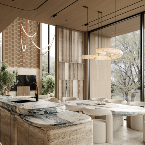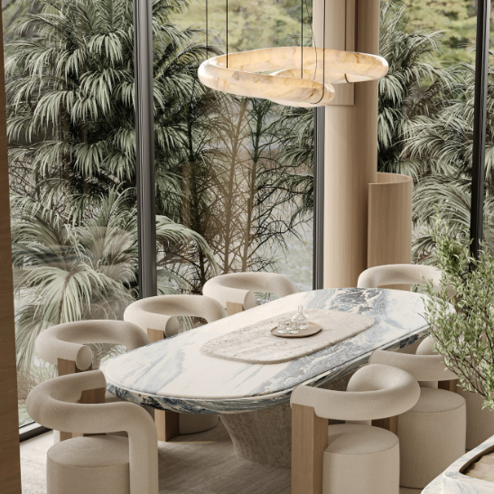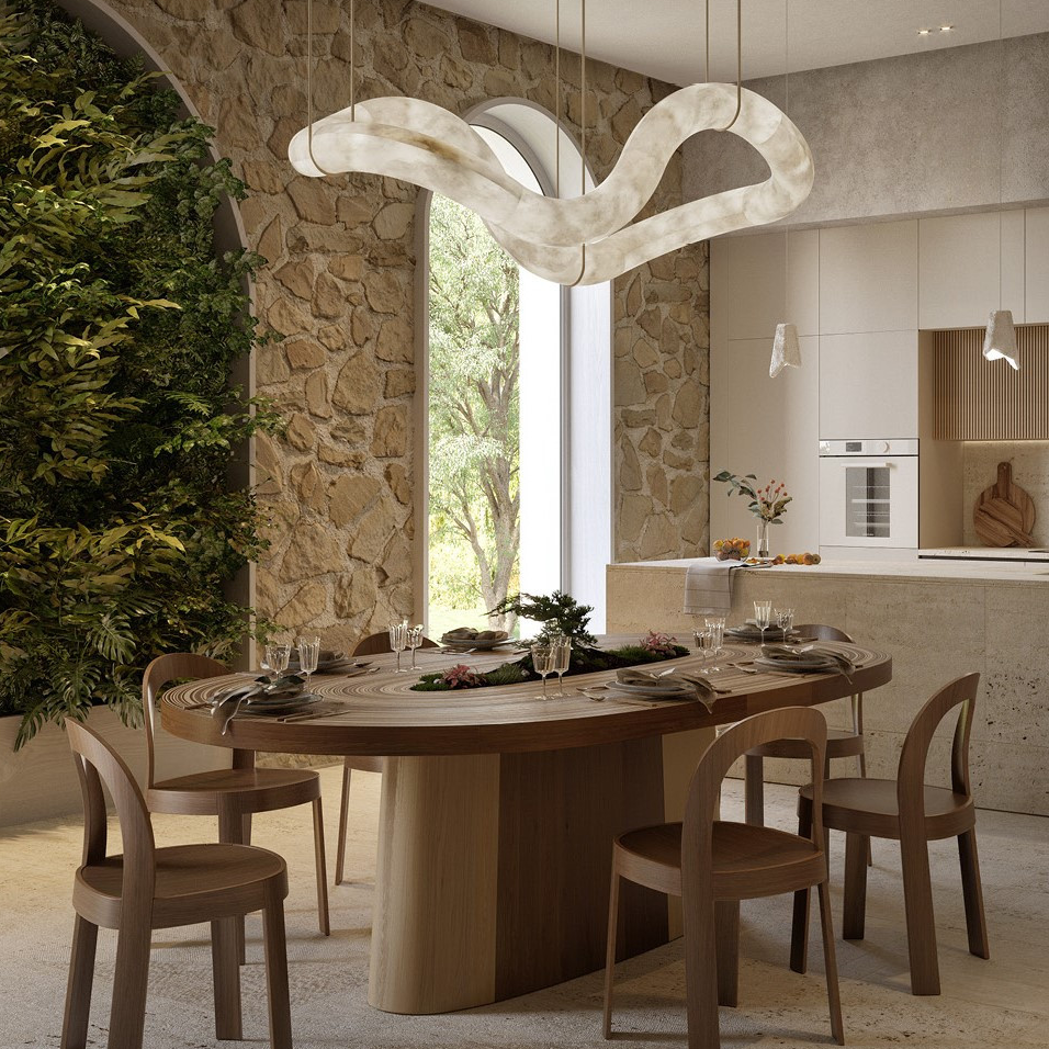 A sculptural pendant light formed by intertwined, flowing loops suspended delicately from the ceiling. The soft off-white, stone-like finish brings an organic calm, while fine brass suspension cables add lightness and elegance. Positioned above the dining table, the fixture acts as a functional art piece, harmonizing with the neutral palette, soft furnishings, and natural light. The overall composition conveys modern luxury, balance, and understated sophistication.